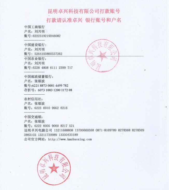 昆明卓興科技有限公司打款賬號